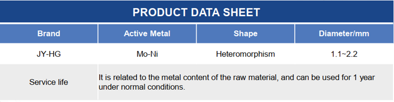 JY-HG catalyst is a hydrogenation protective agent .According to the principle of activity from low to high, a series of hydrogenation protectants adopts the shape of special-shaped particles to retain a high porosity, ensure a high scale capacity and a certain hydrogenation demetallization capacity, and play a protective role for the main catalyst.